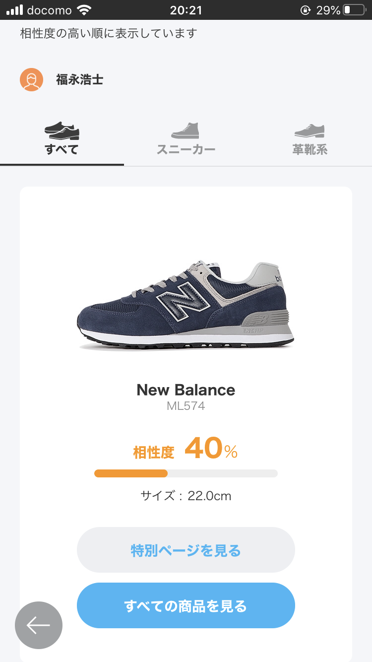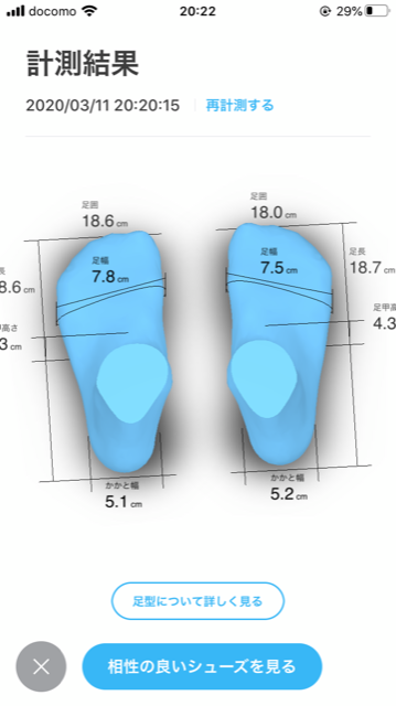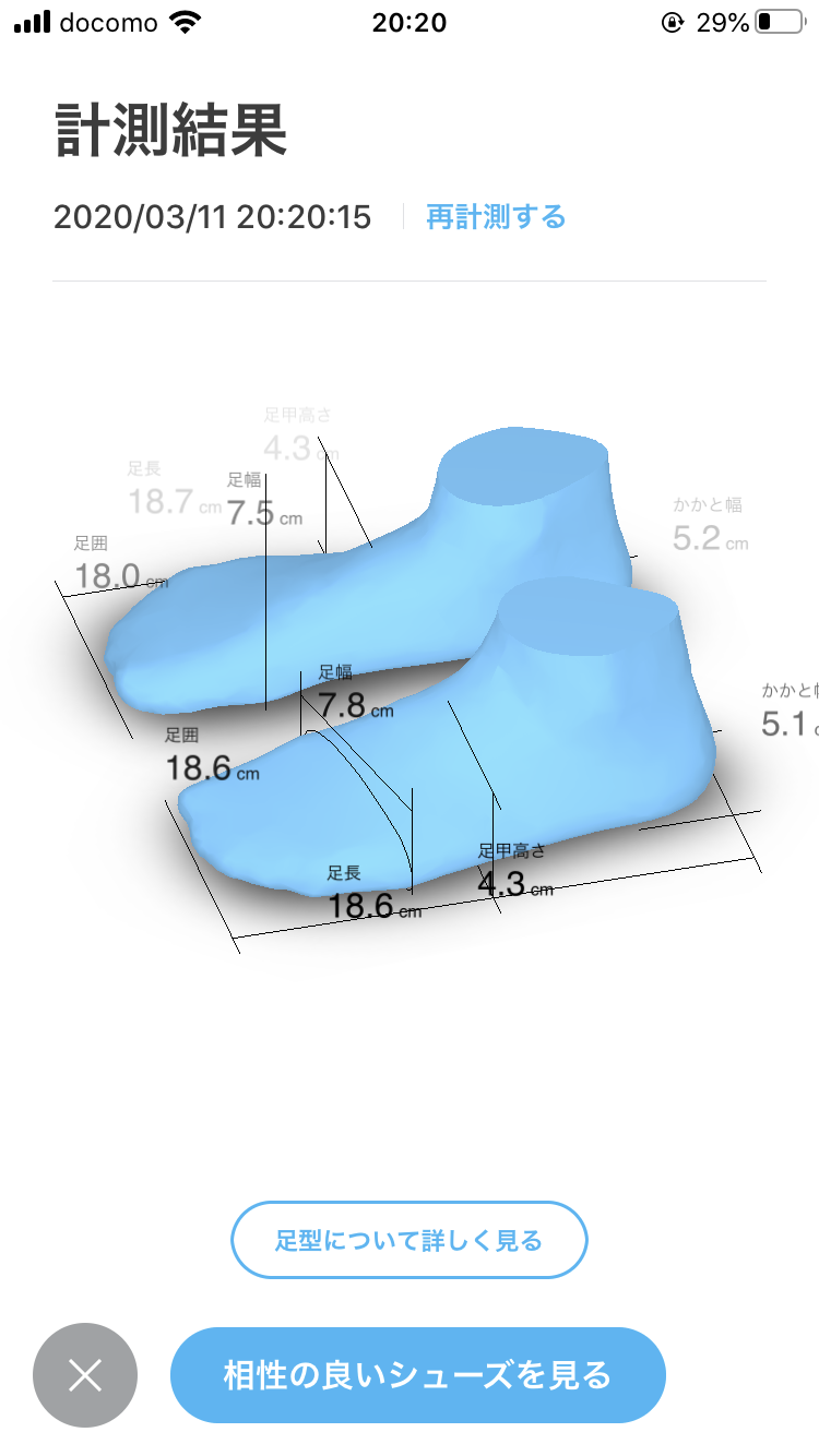オススメの靴は実際着用している靴においてもより大きなサイズのもの(+0.5~1.0cm)を勧められており、複数の靴においていずれも大きなサイズをオススメとして表示されたので個人的な感想としては、少し不安があります。