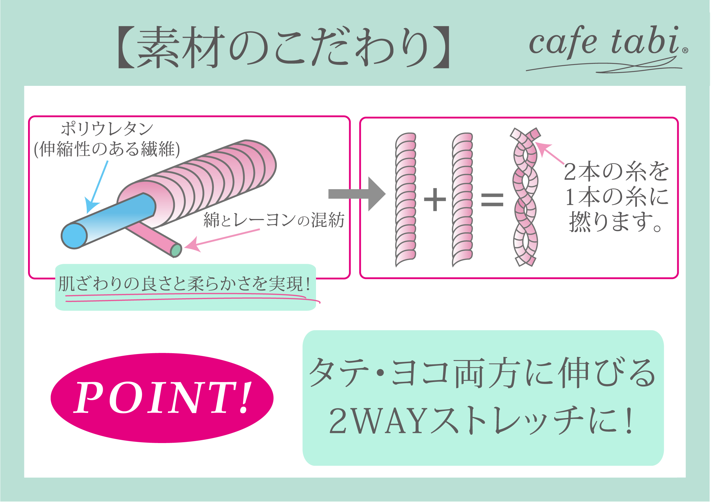 今回カフェタビのメイン商品、テーパードパンツではこのような糸を贅沢にもタテ・ヨコ両方に使用し、キレイさ、肌触りの良さ、快適さを兼ね備えた生地を開発、仕上げることができました。はくと快適さを実感していただけると思いますが、「混紡」や「双糸」がその根本になっています。生地の混率を見ただけでは分からない、生地の開発やものづくりは奥深く楽しいものであります。