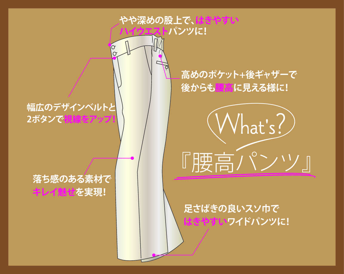 “トレンドのハイウエストを取り入れやすく”をコンセプトにしたワイドパンツで、一目で「腰高」とわかるデザインをプラスしています。実際の股上寸法をラクきれいワイドパンツと比較してみると1cm程度の差しか無く、一般的なワイドパンツと比べてもやや深めという程度の股上設計にしています。こうしてみると実は極端な腰高ではないのです。ではなぜ腰高に見えるのか?というと、幅広のデザイン帯とウエストボタンをタテに2つ並べたハイウエスト風デザインにしていることが大きなポイントです!また後ろギャザーの上部分にもヒラヒラするギャザーをポイントにして視線が上に行くようにしています。