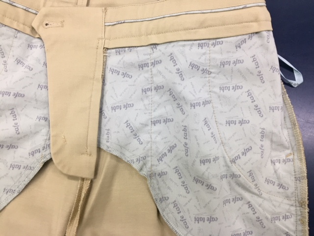 ポケット袋布には、cafetabiロゴをプリントした素材を使用しています。実はこの袋布、cafetabiパンツ専用に開発した素材です。素材自体にも特徴があるのですが、この袋布の付け方にも秘密があります。