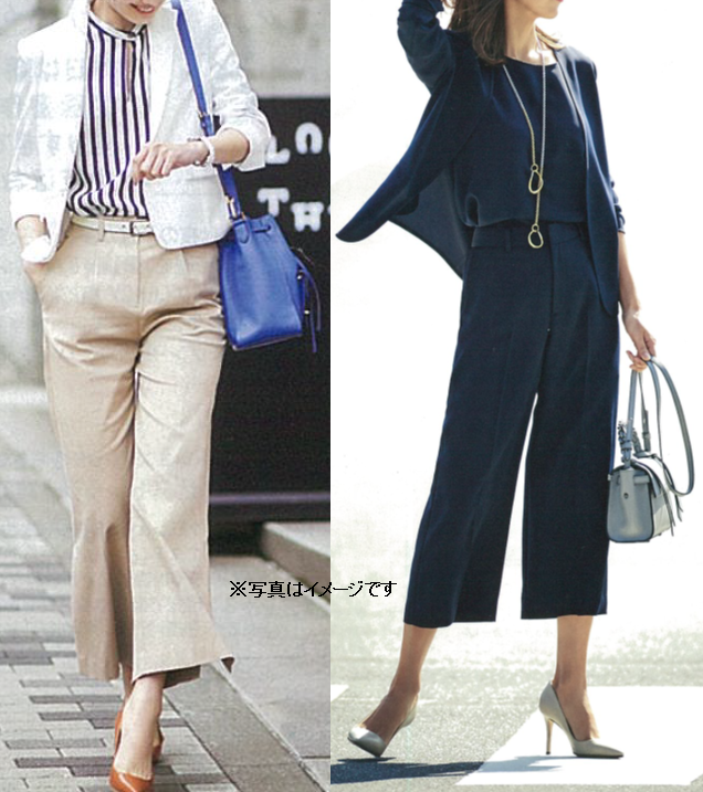 旬のワイドシルエットでかっこよく、クロプト丈で涼しさも感じられます。このパンツはスラックス仕立てできちんと感がありますので、ジャケットとあわせるとお仕事でも素敵にはいていただけます。