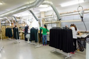 生産ラインは5つあり、月産約6万本の能力があります。本縫いミシン、カバーリングミシン、インターロックミシン、本縫い2本針ミシン、2本針オーバー、スクイ、カン止めと縫製設備も充実しています。