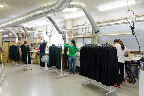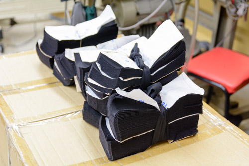 協力工場は、当社と同じ広島県福山市にあり、車で30分程のところにあります。裁断・縫製・仕上(アイロン)・検品を一貫で行っており、月産約6万本の能力があります。主に縫製されているのはレディースパンツで、殆どがウエスト総ゴムでハイテンション素材を得意とされています。社員は90名程で、管理・指導を日本の方が行い、縫製については中国・ベトナムの方が主に行っています。